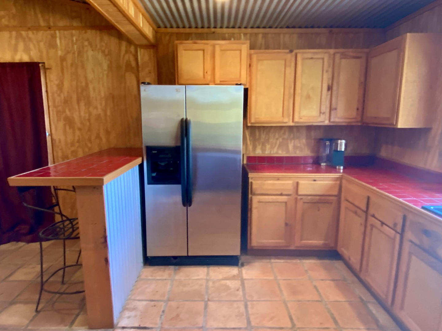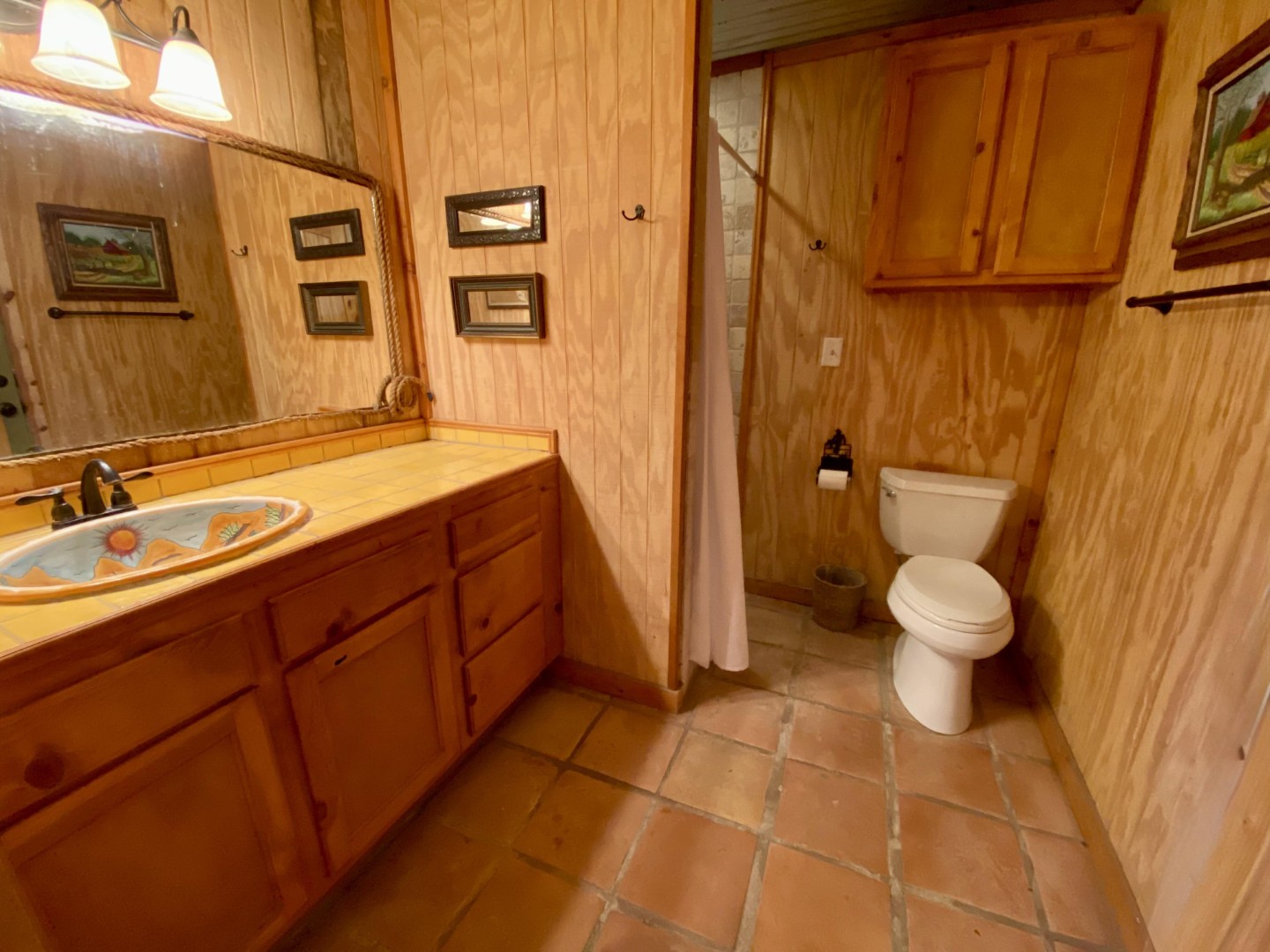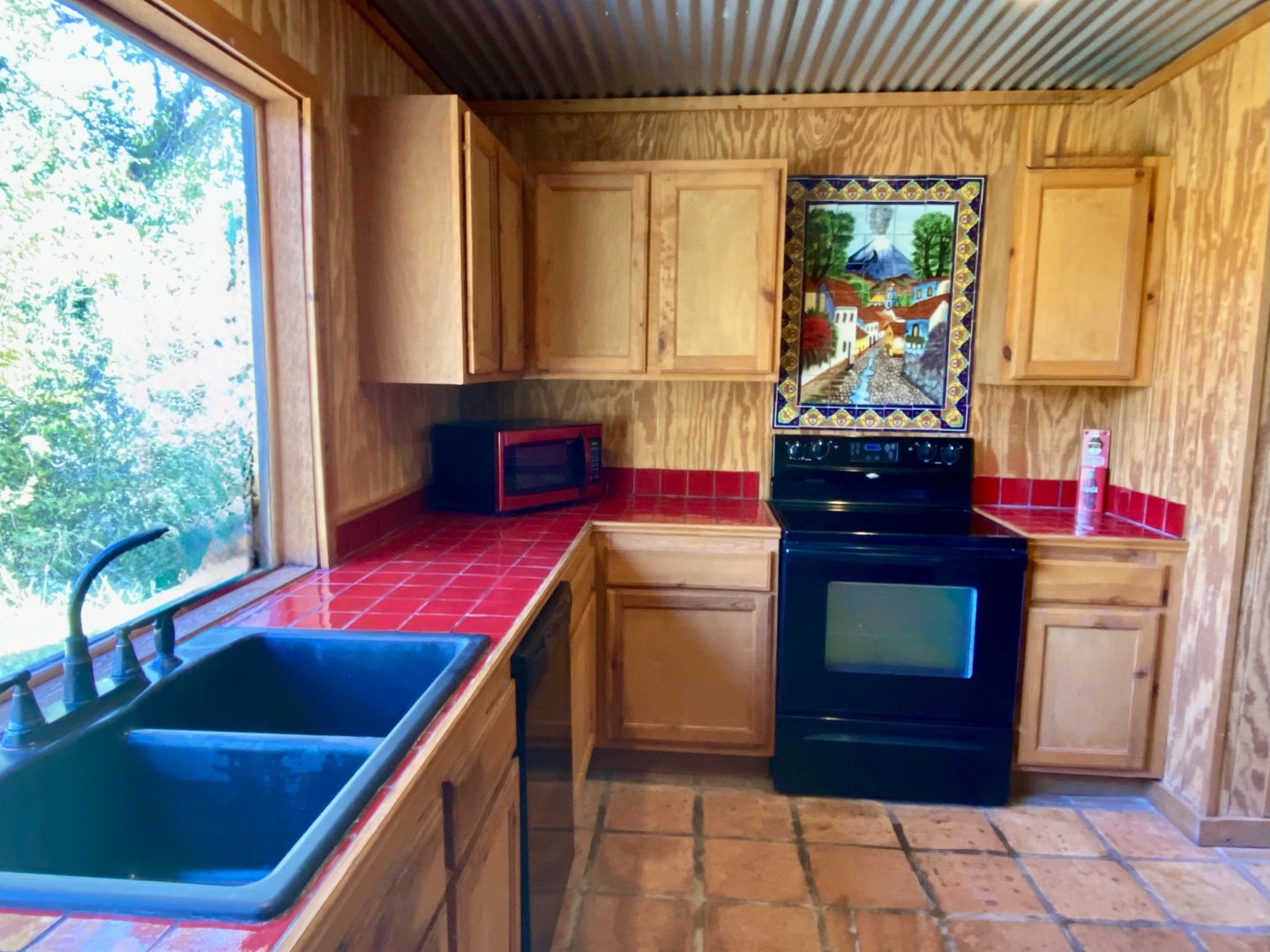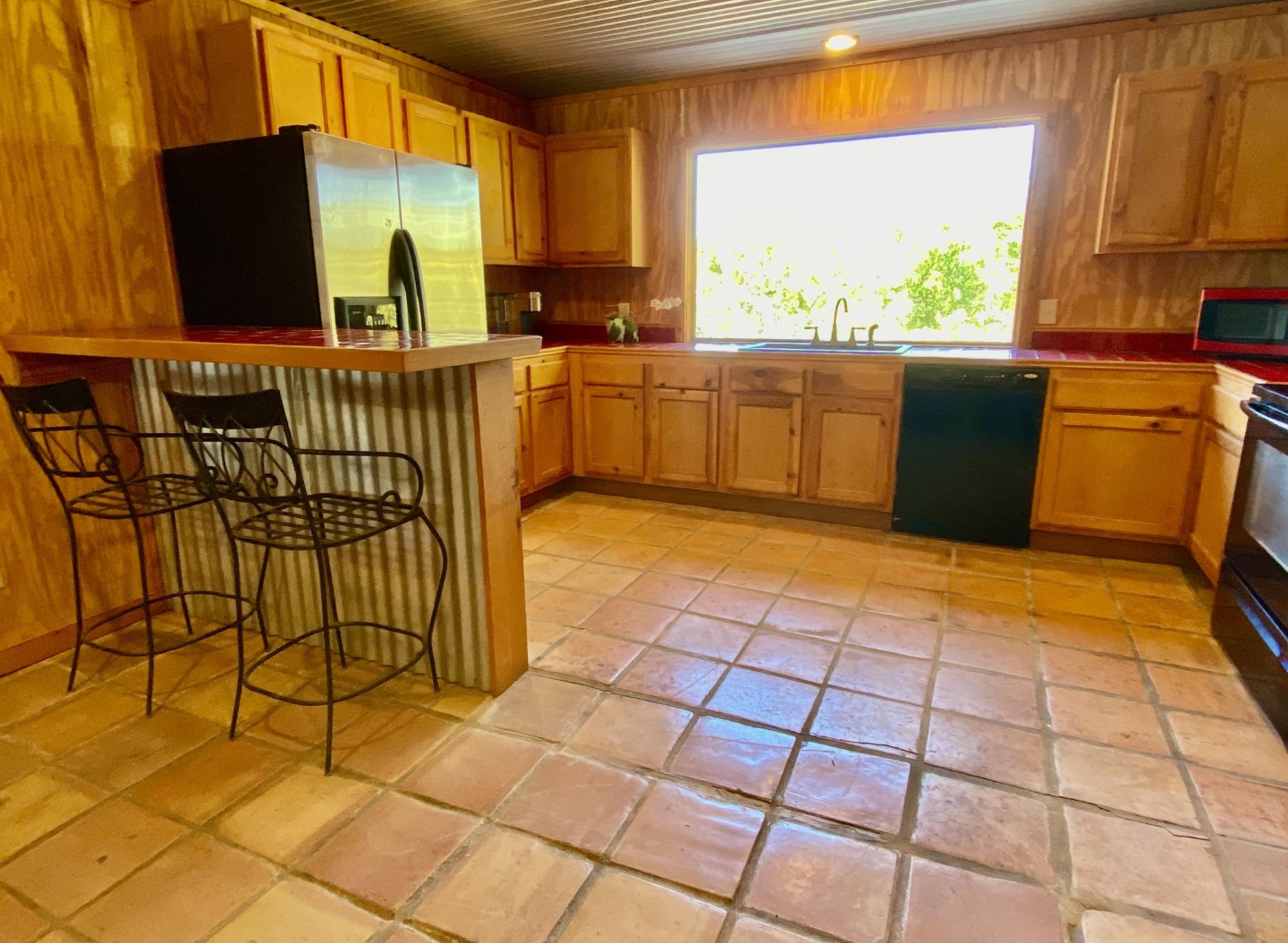 Buck-a-Roo is a Spanish style 3 bedroom, one bath retreat has the 2nd full size kitchen with island bar and sturdy wrought iron bar stools. Large picture window overlooking mature trees and mountain tops views. Vaulted ceiling, Saltillo tile floor and full bath with cream tile shower. Four (4) sets of French doors lead to (2) covered porches, one off each bedroom, with comfortable outdoor furniture.