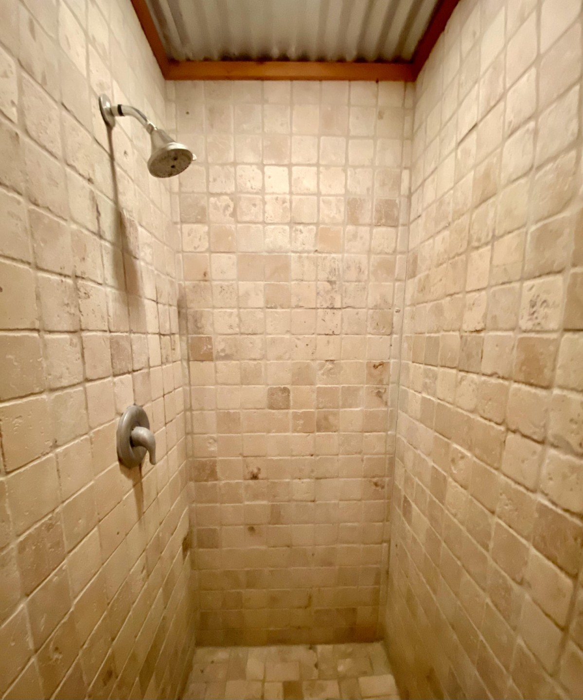 Cool lighting accents the bunk room, w/ (2) sets twin bunk beds & (2) twin beds. Pretty white tile bathroom w/ wall niches & shower bench seat. Opens to the courtyard.
