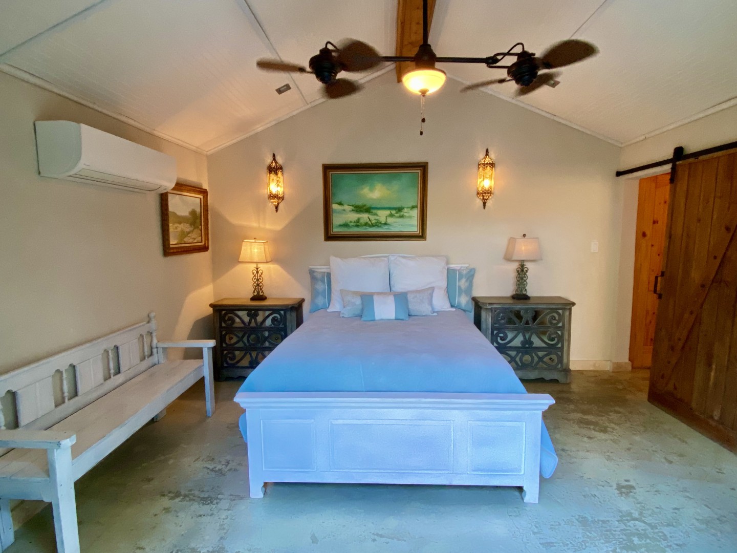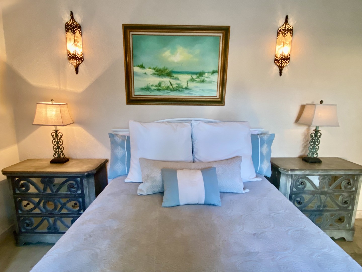 Midnight swim? 3 steps to dive into the aquamarine swimming pool to cool off and then return to your private oasis. Each morning awaken to tropical flowers outside the french doors to your romantic Master Bedroom. Custom King size bed, armoire, chic accents and upscale bedding are all from Mexico. Ensuite bath has double sinks, large walk-in shower w/ 3 shower heads & bench seating.