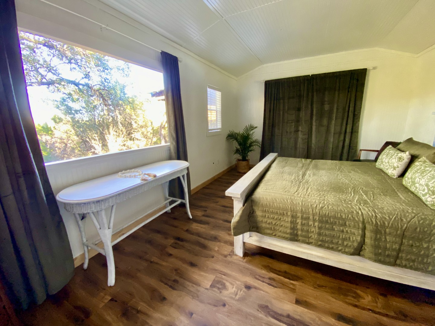 Step thru French doors into this romantic 1 bed/1 bath white-washed oasis overlooking mature trees and distant mountain top views. This seductive getaway has a King size bed with upscale bedding, vaulted ceilings, plantation shutters, wood floors and ensuite bathroom. There's also a twin bunk bed tucked into an alcove.