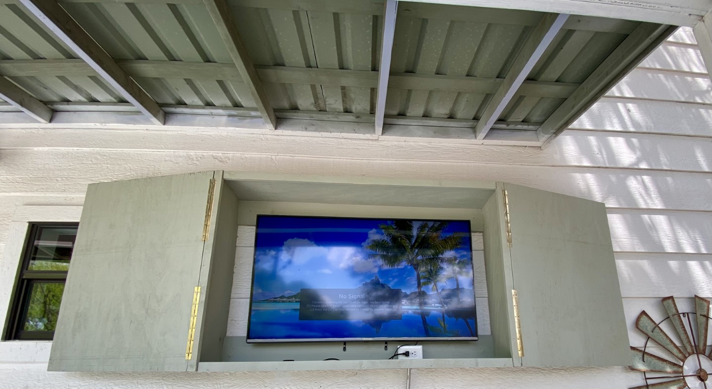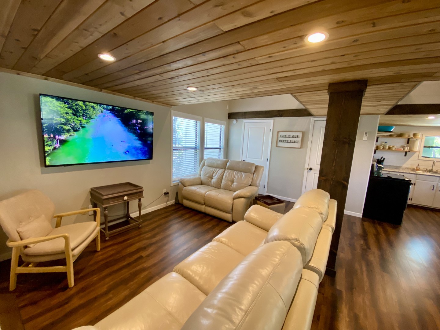 An expansive wood deck is calling your name for outdoor entertainment with a big screen Smart TV for watching games or listening to music. Party lights for night-time ambience. This is serious relaxation!