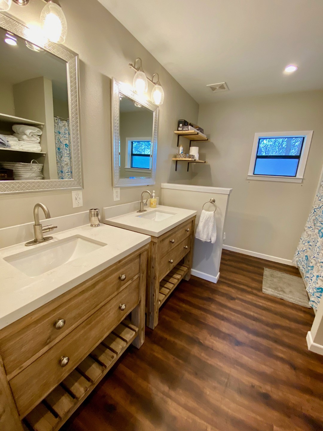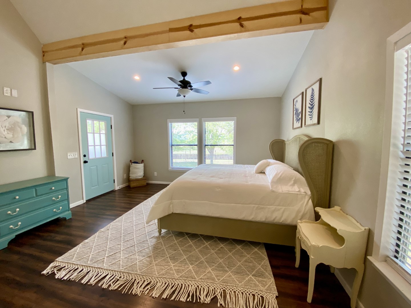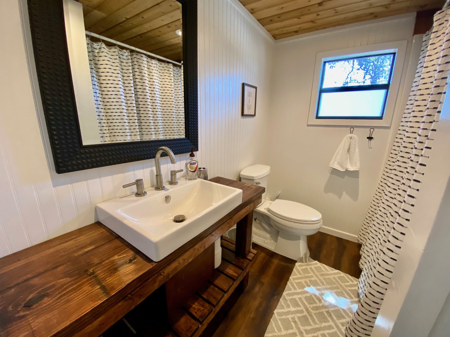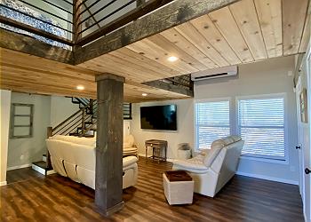 Downstairs the main attraction is the Texas sized master bedroom with King sized bed, 20' vaulted ceiling and luxurious ensuite master bathroom stocked with little luxuries like soaps, shampoo and hair dryer. There's a separate exterior door that leads directly to the screened-in front porch. Wall of windows look out over the views and there's plenty of window light that filters into the room for an aha moment. Upstairs you’ll find a glamorous sleeping loft with 2 Queen beds, with 15' vaulted ceiling and open beams. The private 3rd bedroom has (2) Queen size beds, luxury bedding, vaulted and wood flooring. You'll love the new upstairs bathroom with wood floors, large tile shower, double sinks and vaulted ceiling. There's also a laundry room with washer & dryer. Sheets and bath towels are not provided, but can be for an additional fee.