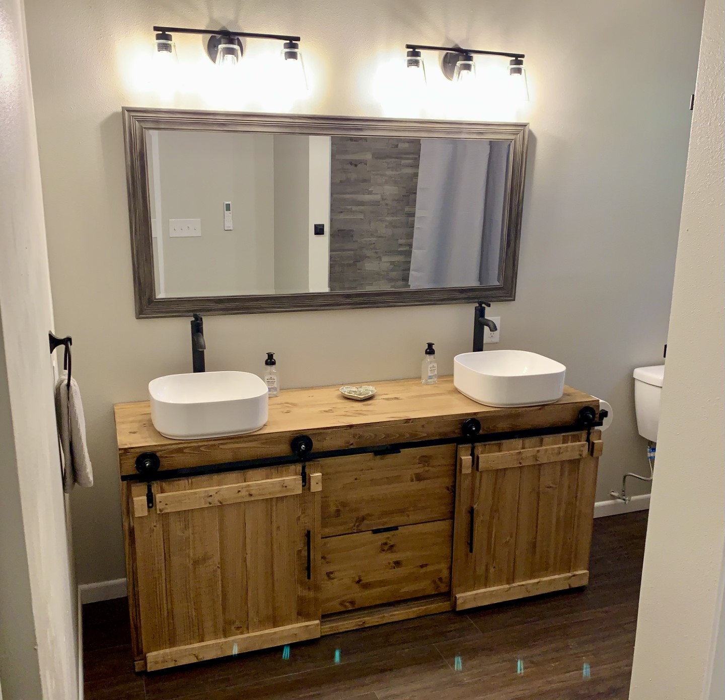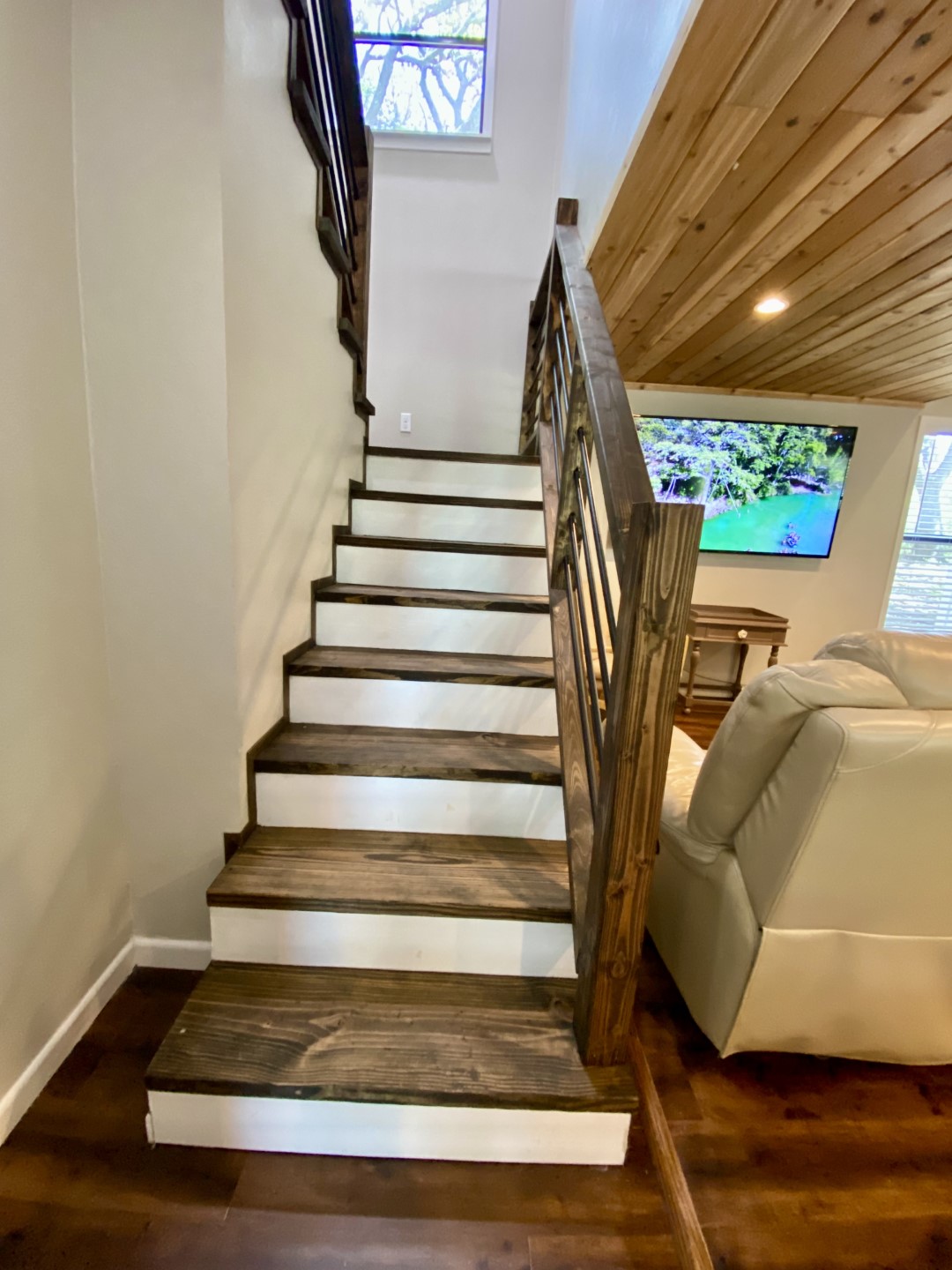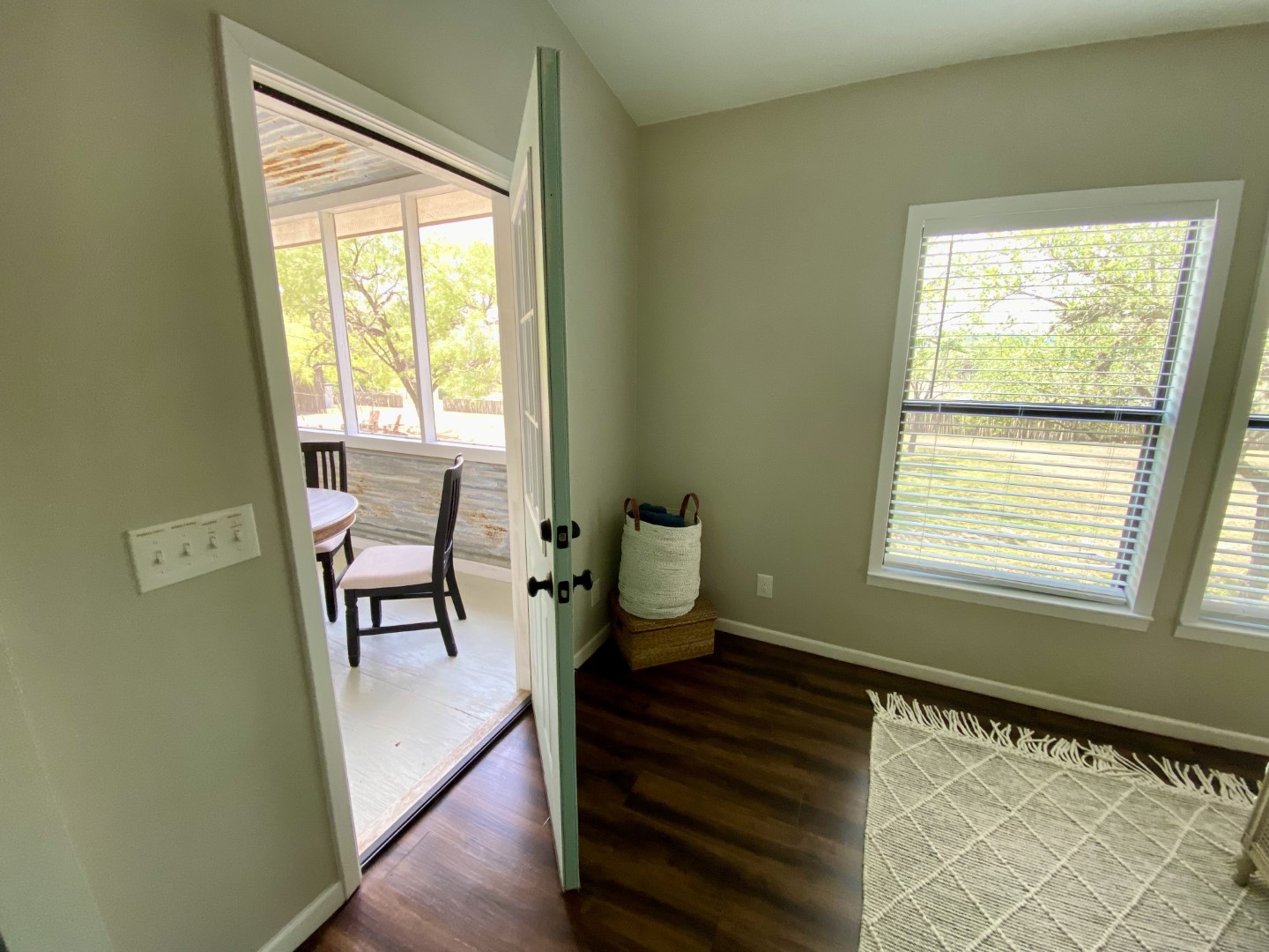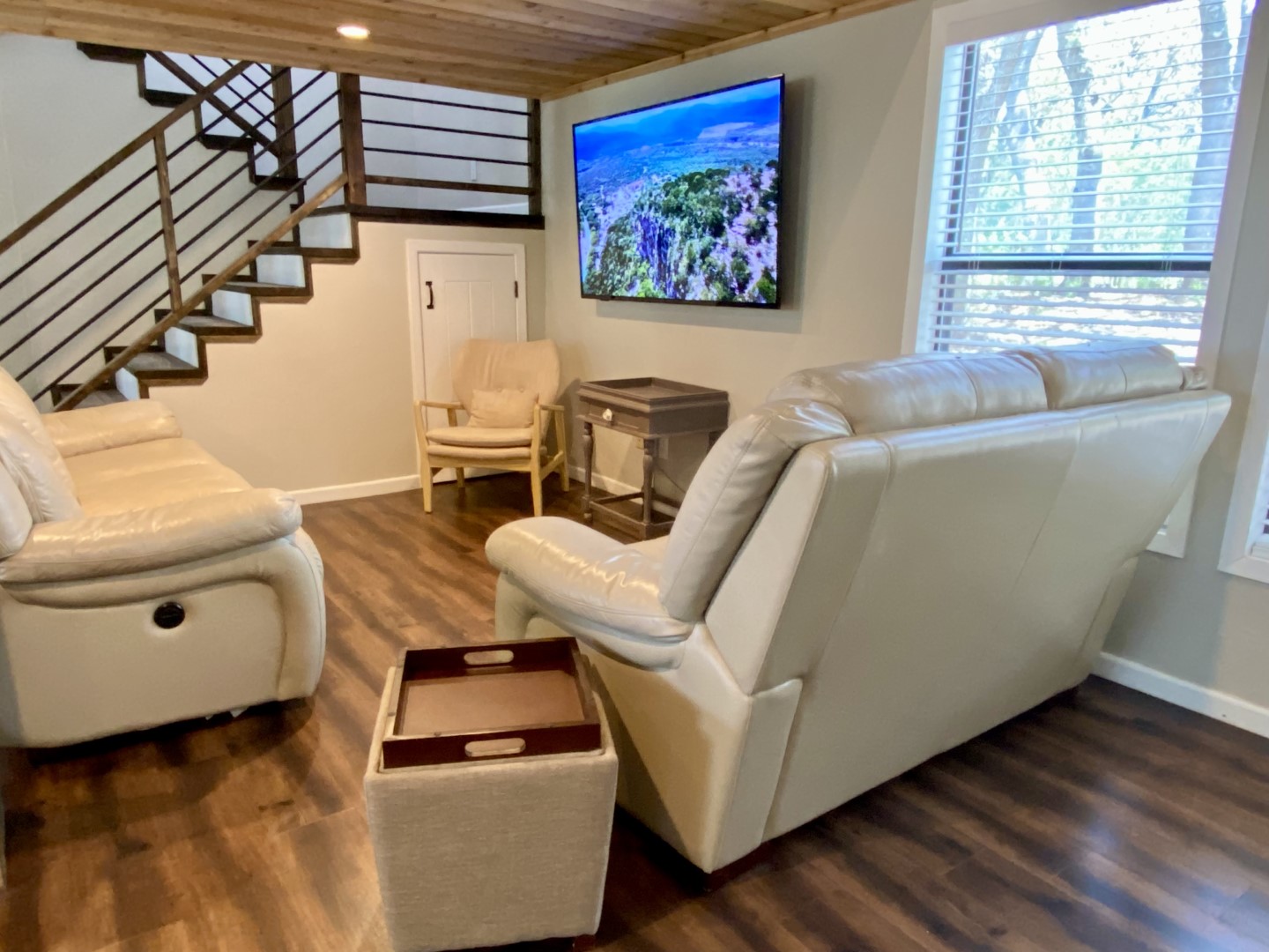 Check out the big fire pit for s'mores and dual set of horseshoe pits for serious family & friends playful competition. The whole family will enjoy corn hole, tetherball or a game of volleyball for ultimate playtime. Outside relaxation includes sturdy lounge chairs, tree swings and charcoal smoker that has stunning pastoral & mountain views. This two story sweetheart is stunning, with the entire front of the house is a screened-in porch overlooking long range mountain views above the flat grassy pasture. Step inside and you’ll find a two story 30' vaulted entrance with beams, wood floors and two story ceiling. Open concept kitchen, dining and living room. There's super comfy sofas, new custom dining table & benches and an easy flow functional kitchen. The main floor bathroom is large, chic and upscale. Although the style is sophisticated river retreat, the result is comfortable and relaxing.