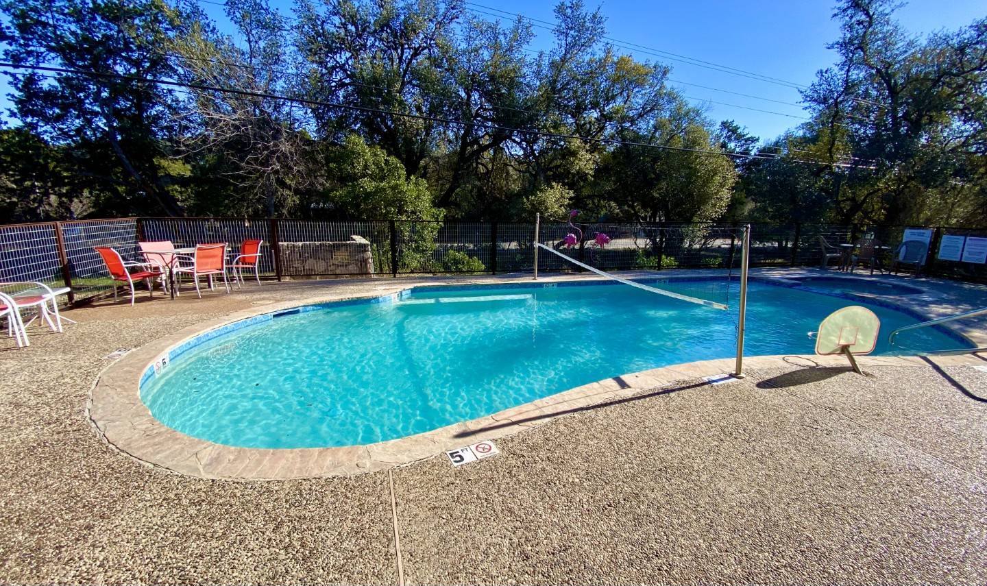 The pool is deep and large, with lots of zero gravity lounge chairs, polo net and basketball hoop for pool fun. Outdoor activities include a basketball court, volleyball court, sunken fire pit, tetherball and horseshoes.