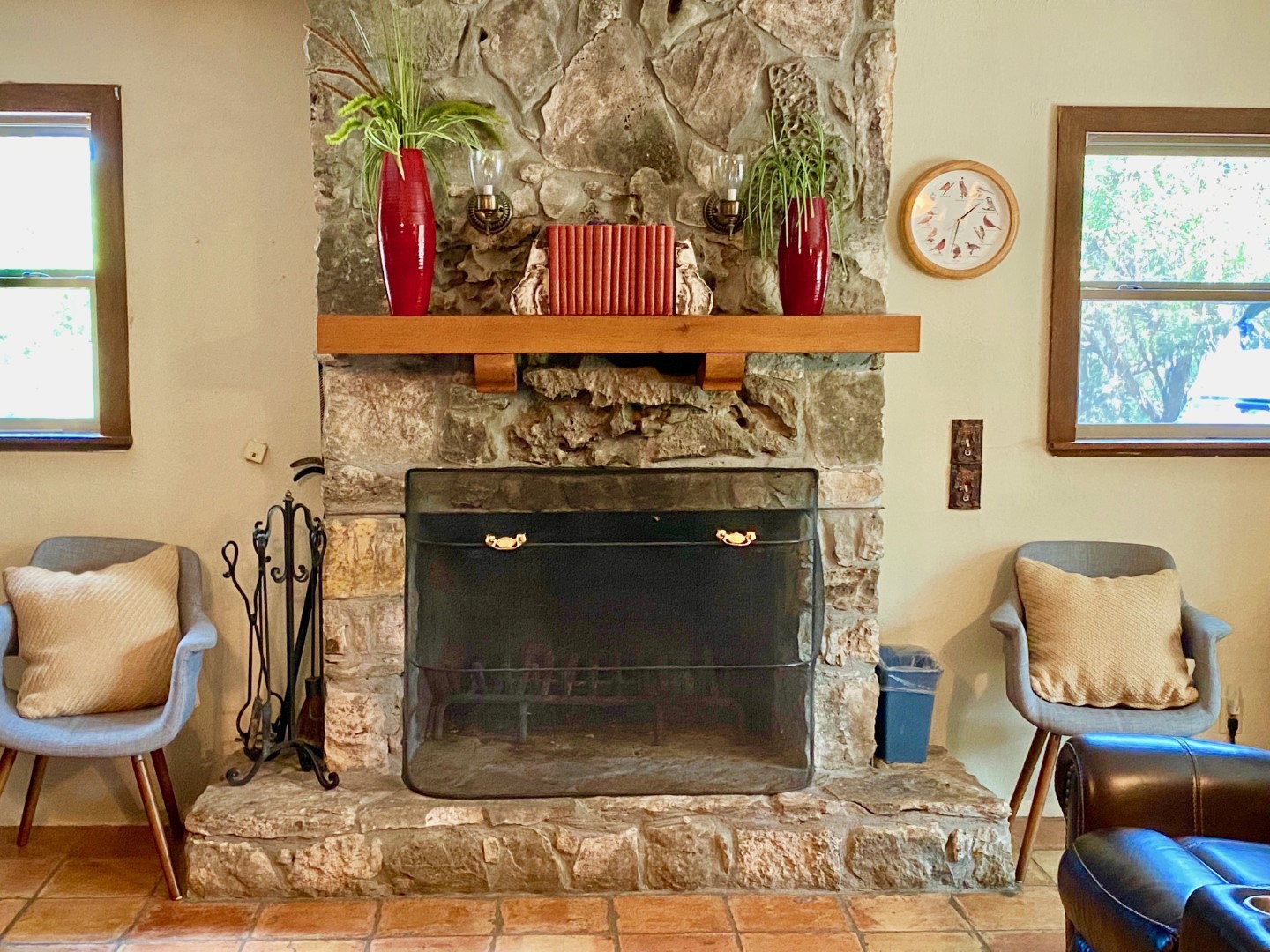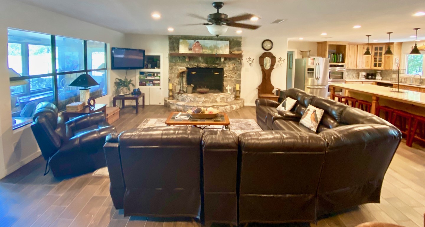 The main hacienda has superb, multi communal living spaces where everyone can gather to eat, watch tv, talk and play games. The Living Room has saltillo tile floor, new leather sofa and floor to ceiling river rock fireplace. The Family Room has a large leather sectional sofa, game table, overflow frig, piano & a second floor to ceiling rock fireplace.