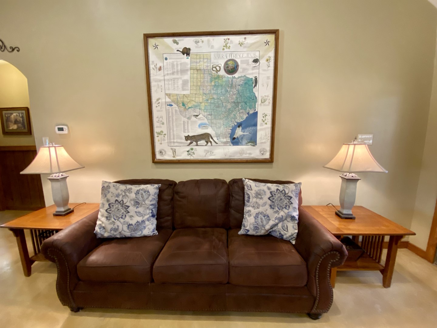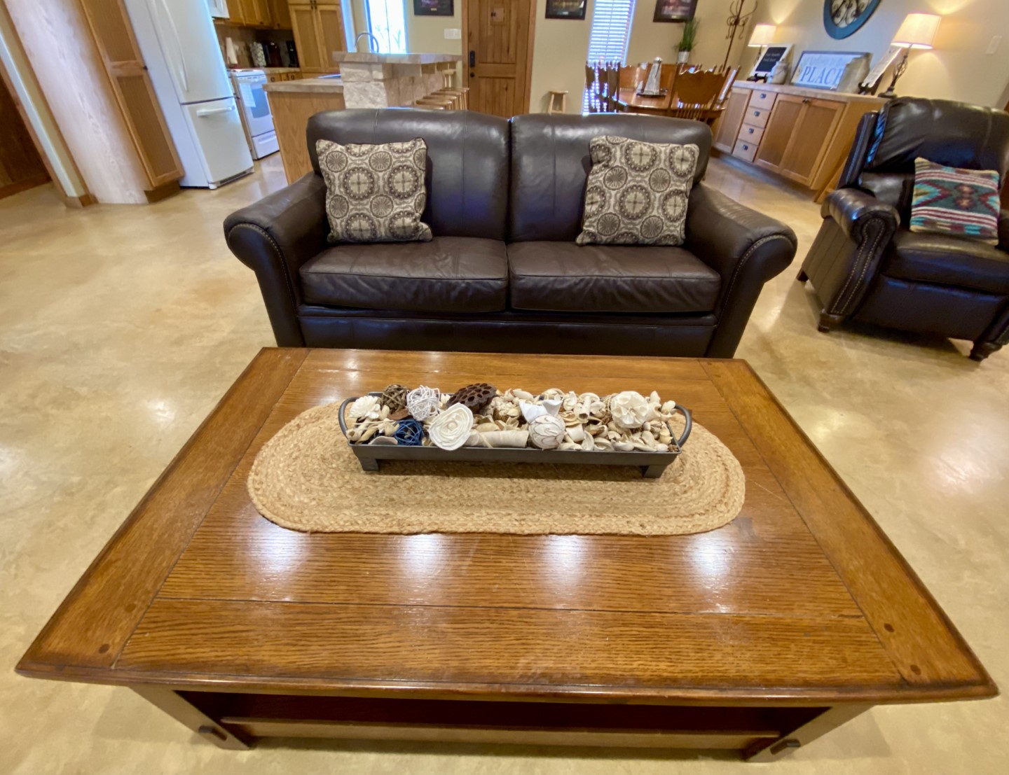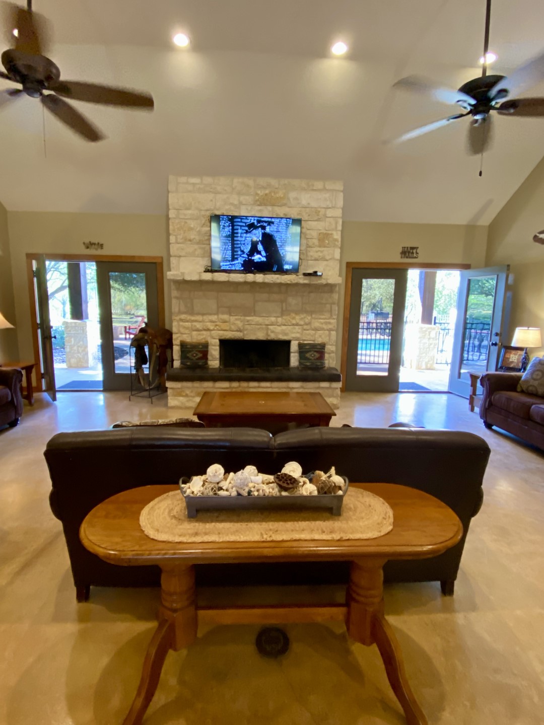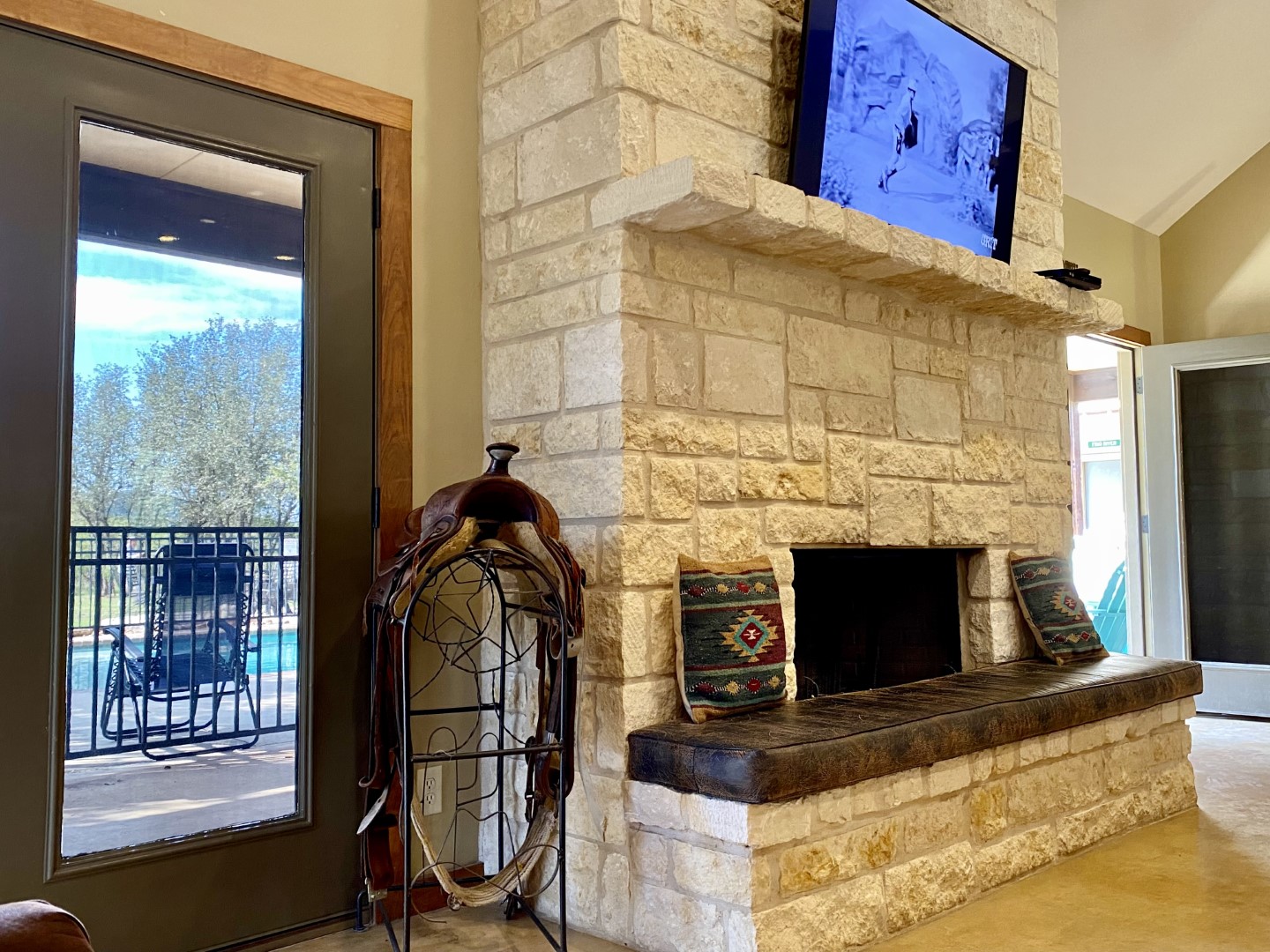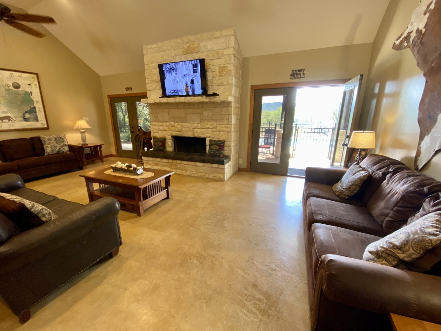 The western great room has 3 large, plush leather sofas. Smart TV can be seen in the kitchen and dining area as well. Floor-to-ceiling white rock, wood burning fireplace with custom leather cushion seating across the entire fireplace for added bench seating.