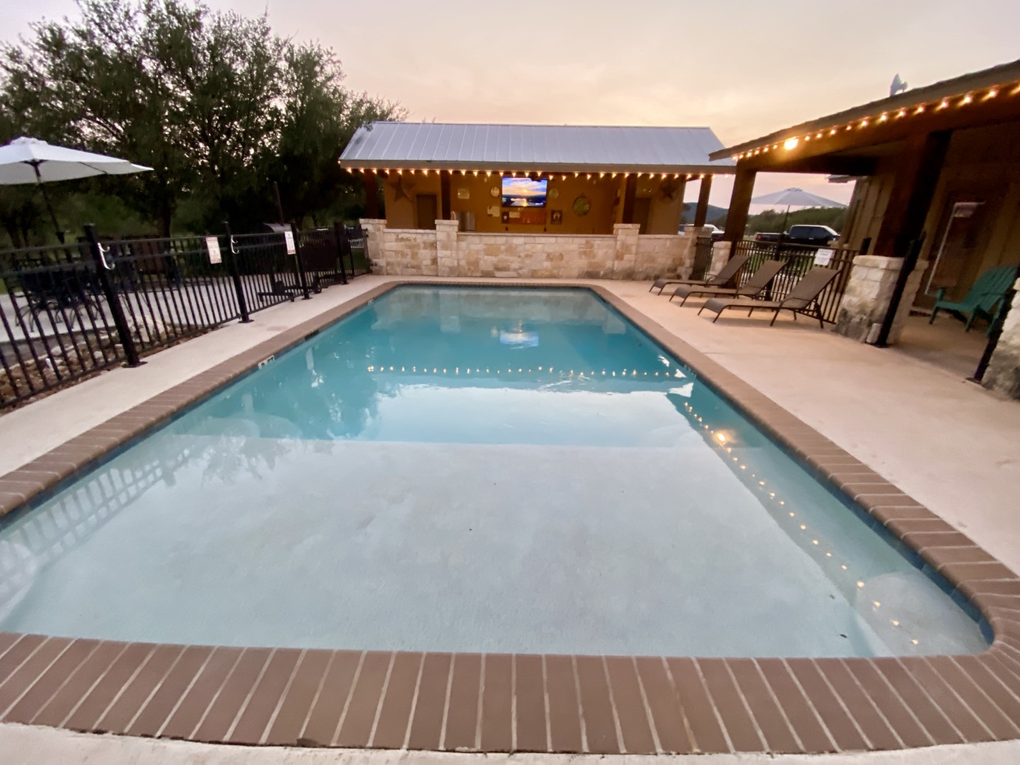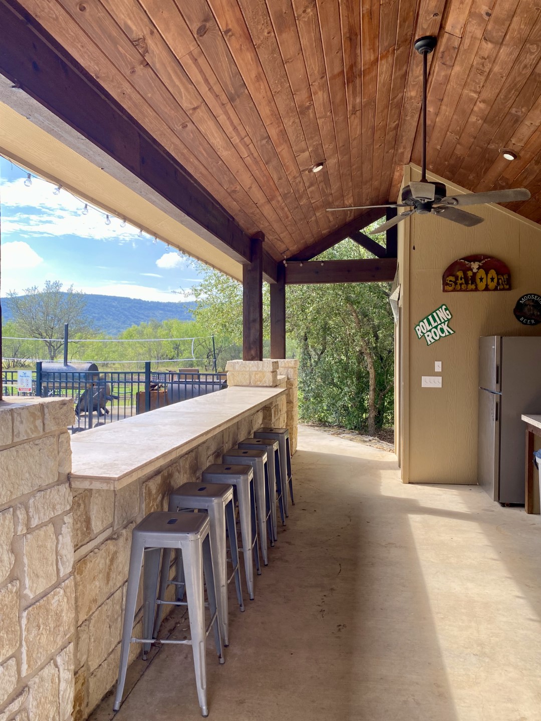 Large white rock Cabana w/ vaulted ceiling, Smart TV, stereo speakers, full size refrigerator, sink & half bathroom. White rock bar with 6 bar stools overlooking the pool.