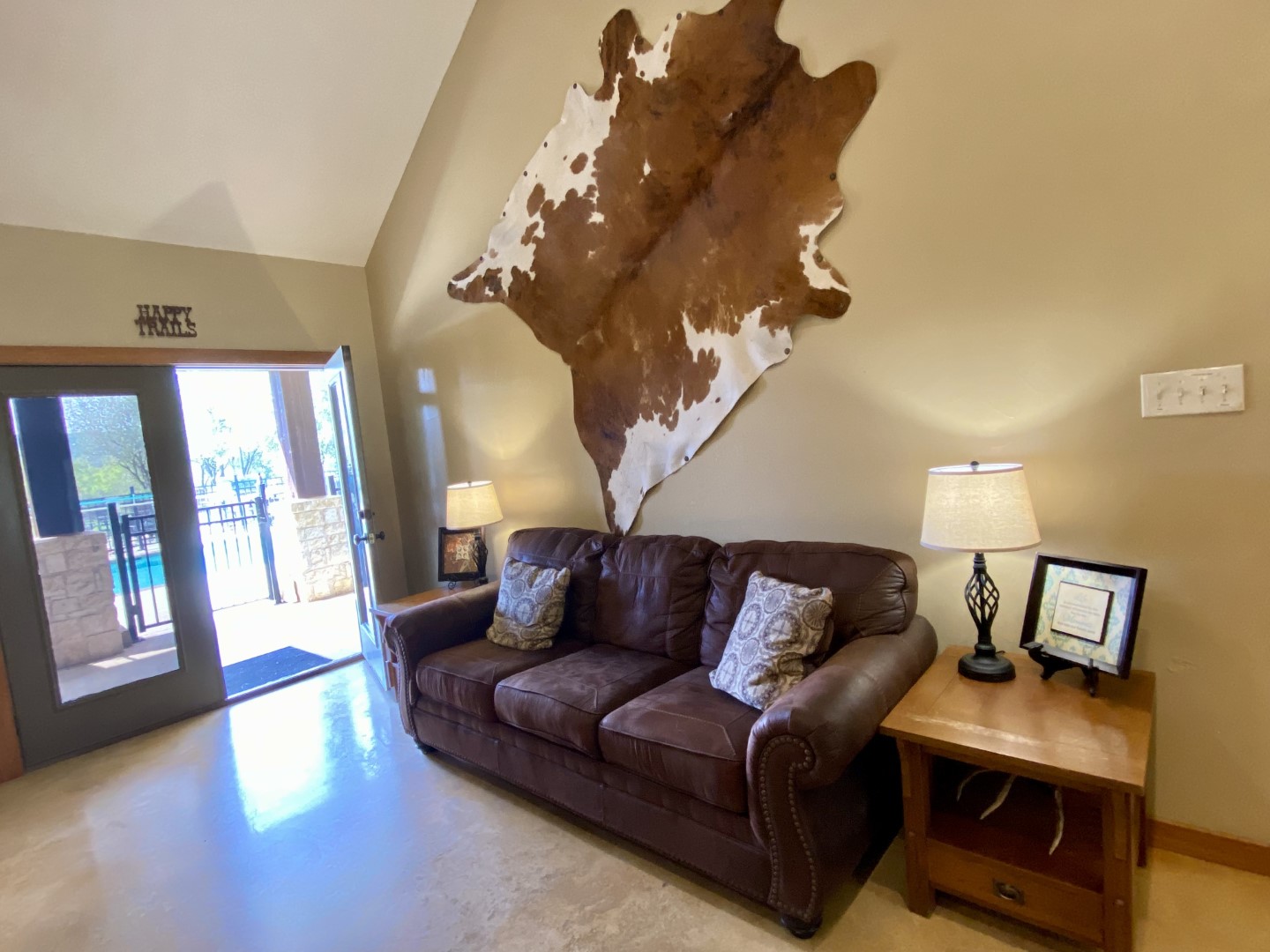 Exceptionally well laid out, there's a bedroom on each corner of the house. Open concept great room, kitchen and dining area with 20' vaulted ceilings, upscale decor & 2 sets of french doors that overlook the pool, entertainment area and poolside Cabana. The entire house has cool stained concrete floors.
