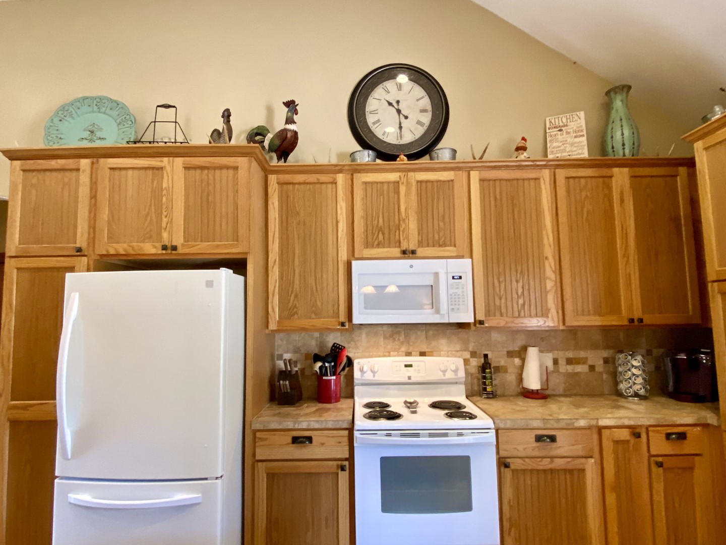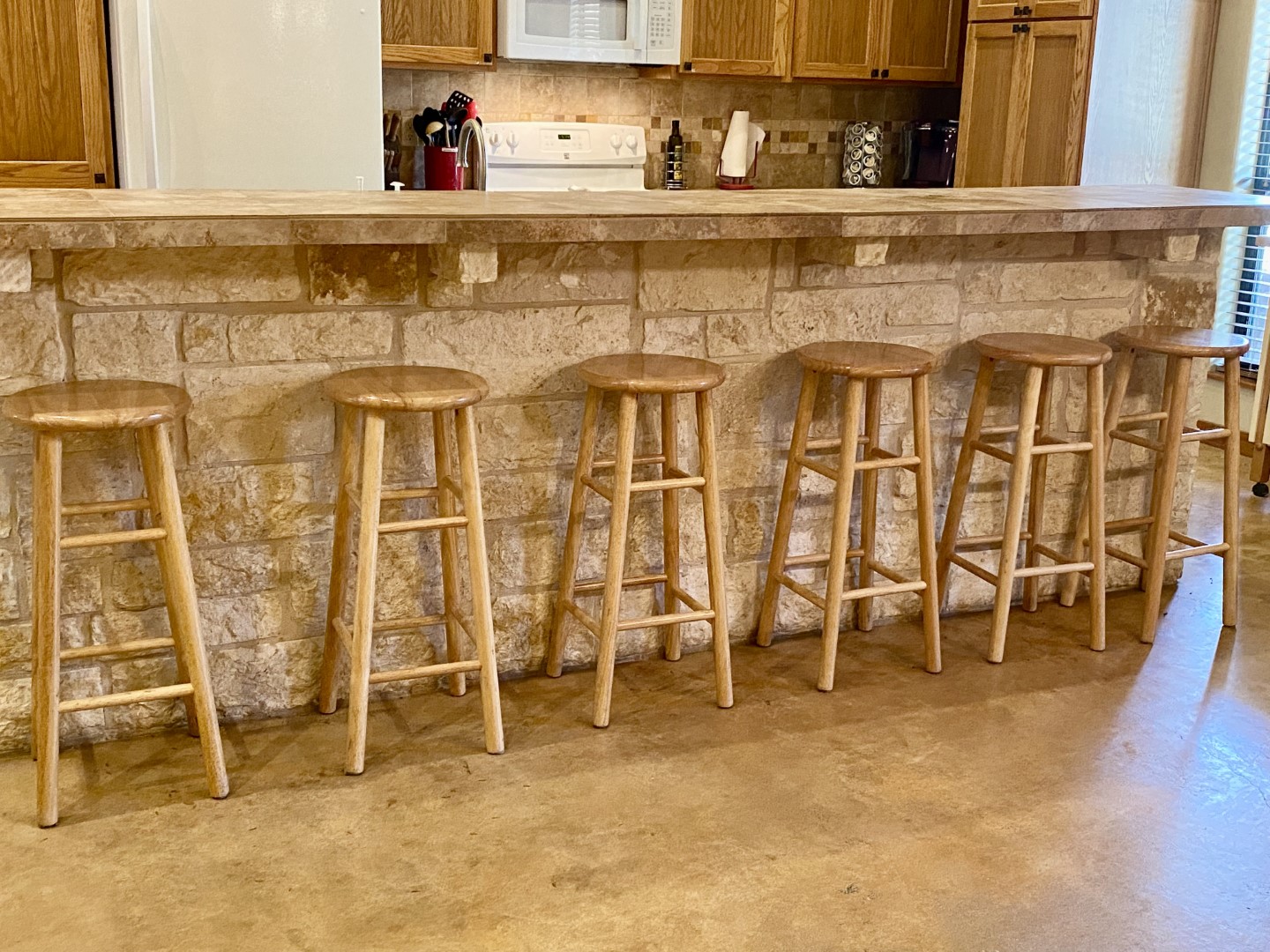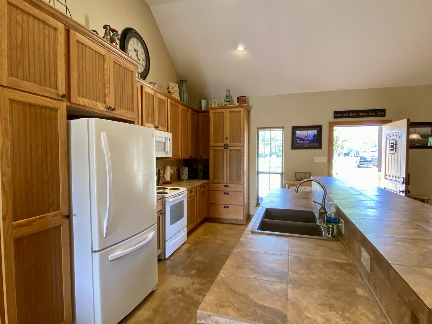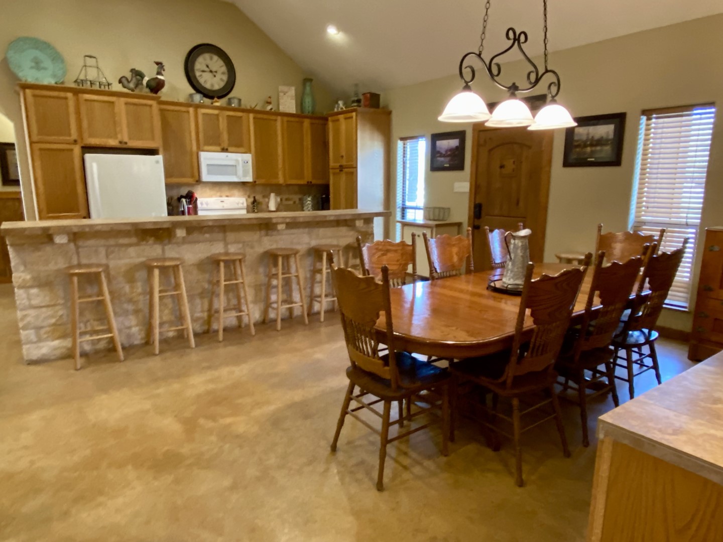Chefs will love the easy flow kitchen that's fully equipped & well stocked with everything you need to prepare family sized meals. Custom tall cabinetry, tile counters and white rock kitchen island with barstools that seats 6. Both regular drip & keurig coffee makers, with complimentary coffee pods & coffee filters.