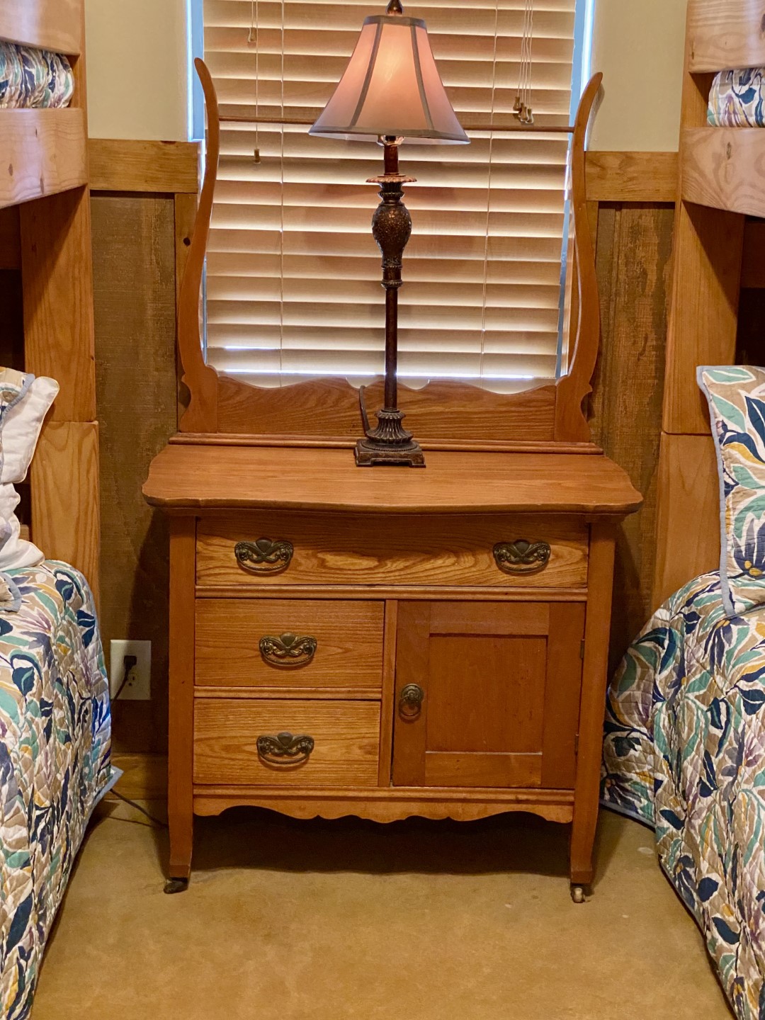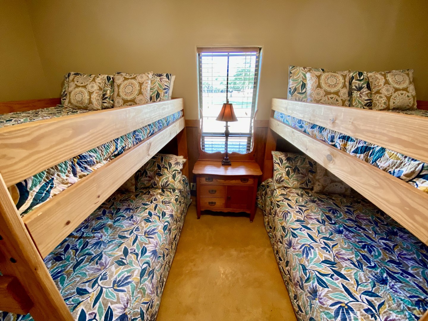 Large, cool bedroom that has (2) sets of full bunk beds, with upscale decor and antique dresser. Ensuite bath.