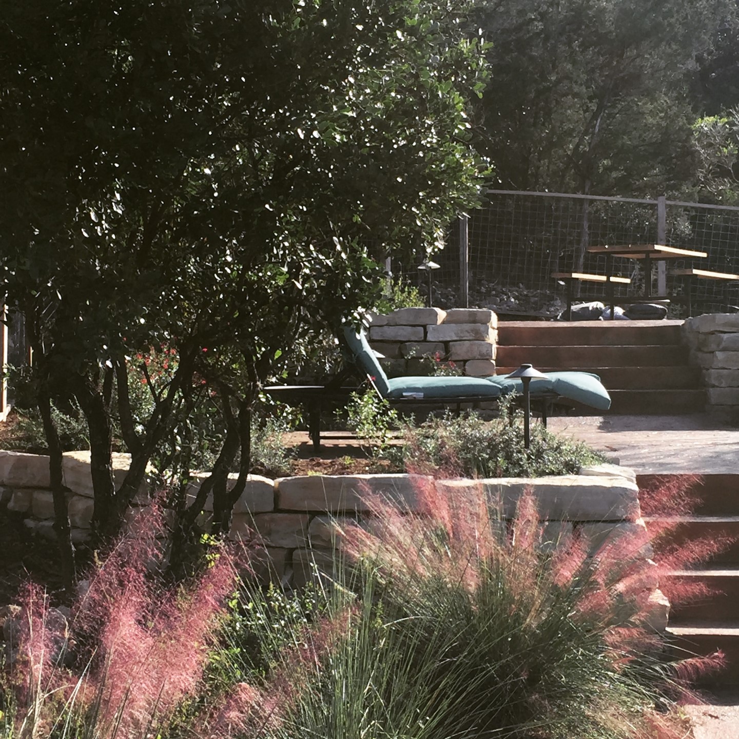 There are several relaxation areas over multiple terraces on (3) different levels, all connected by stained concrete walkways. The new 2021 outdoor fireplace sits on the very top terrace for those seeking an quiet escape, a double lounge chair overlooks the pool on the middle terrace and a large cedar wood beamed Cabana with table and chairs is on the bottom.