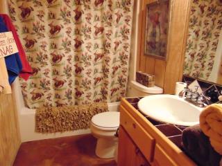 The main floor open floor plan with vaulted ceilings make’s for an ideal gathering place for all your family or friends to be together. Newly polished concrete floors provide no fuss, carefree Frio living. The downstairs master bedroom is very large and has an ensuite master bathroom with double vanity sinks, glass shower enclosure and an old fashion clawfoot soaking tub. Bedroom 2 has a super stylish, western themed decor and hallway bathroom. Upstairs is the vaulted, open concept bunkroom with custom built-in twin beds, romantic pedestal queen bed and ensuite bathroom.