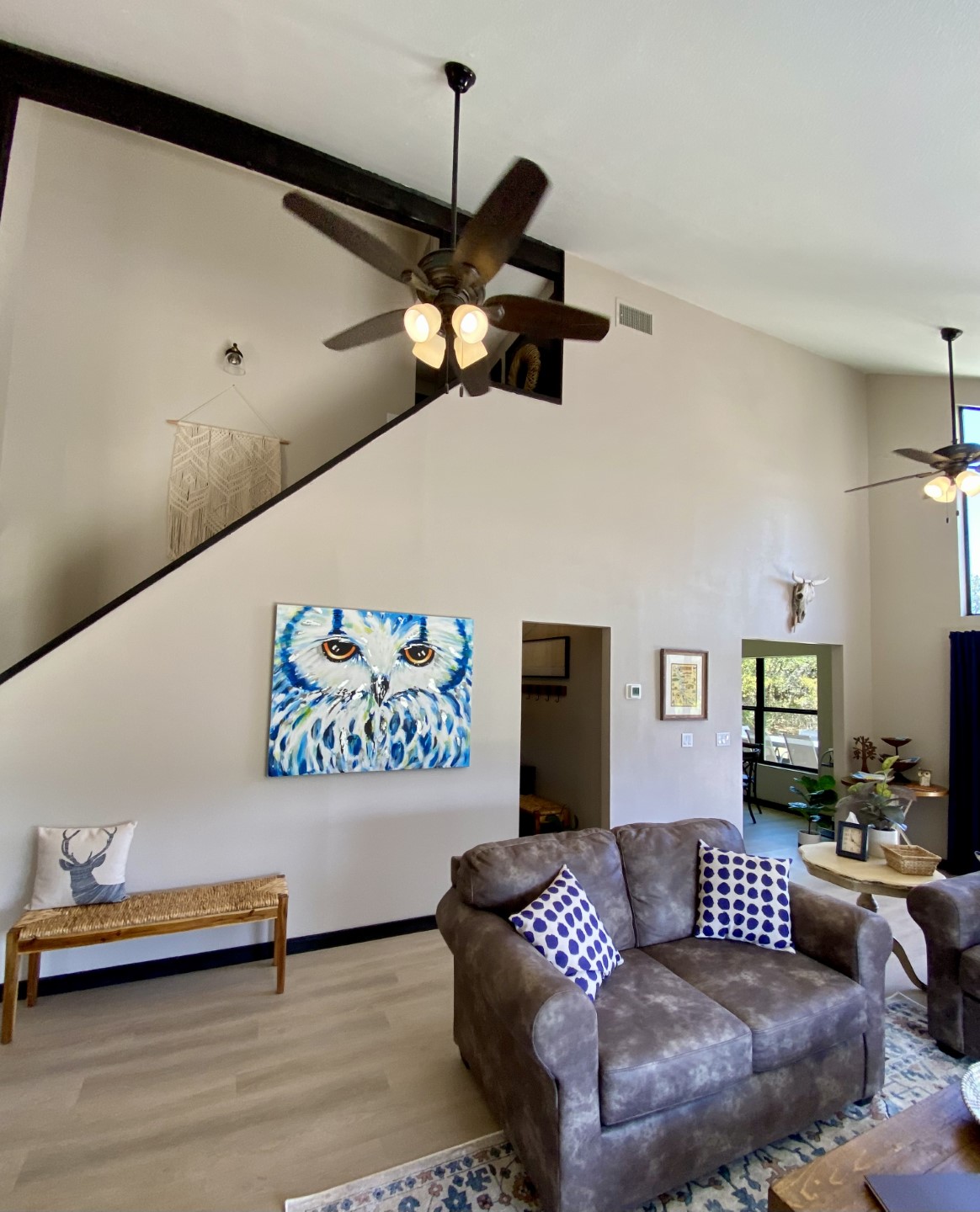 The living room has dramatic 30' vaulted ceiling, with wood stove, wood floor and new upscale furnishings. A wall of windows provides plenty of light, views of the mountain and smart TV for added enjoyment. A open staircase leads upstairs, while downstairs you'll find the master bedroom with king size bed, upscale furnishings and new ensuite bathroom that's been tastefully decorated.