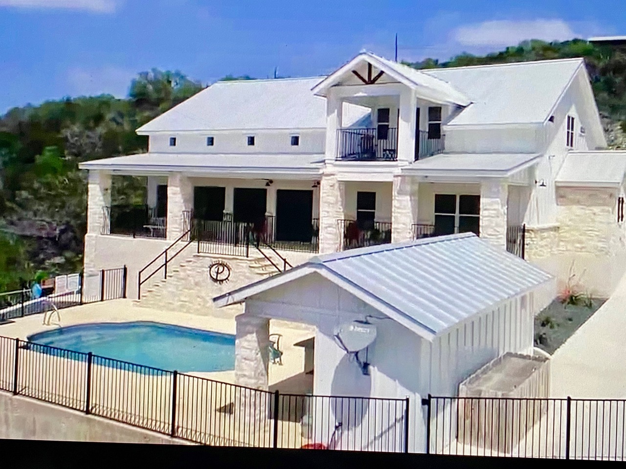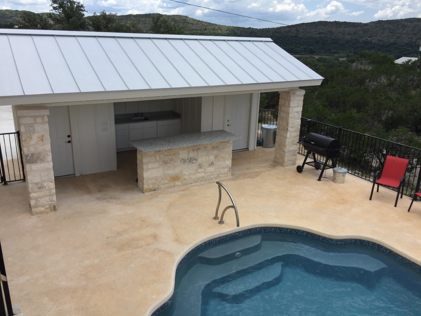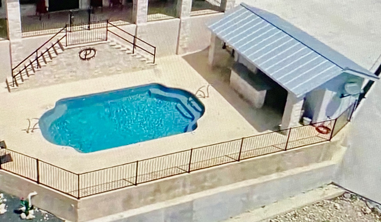 The white rock Cabana has a white rock bar with bar stools, tv, stereo, sink and bathroom that overlooks the pool and views. This outdoor entertainment area is designed for maximum vacation fun! With a sparkling pool and stylish cabana gives you a real treat. Built to take advantage of the amazing views, y’all will love when the sun goes down and nighttime glamour kicks in.