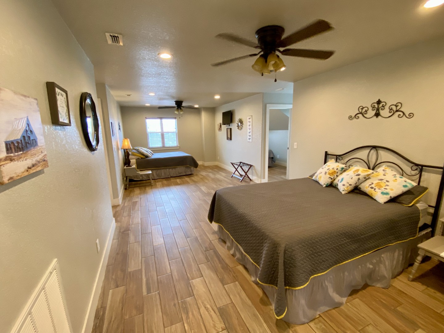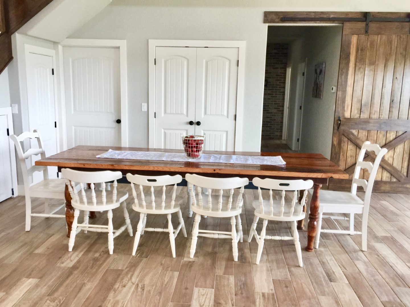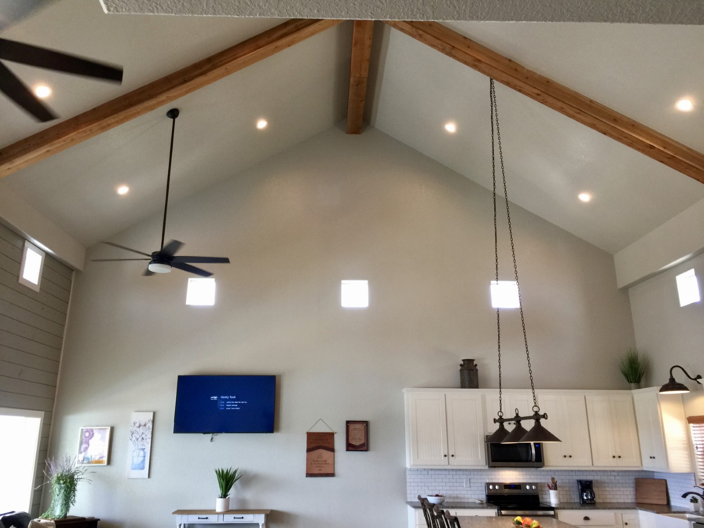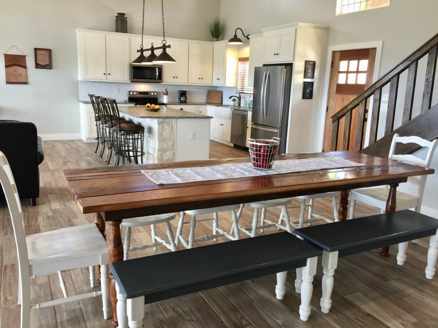 Steep, soaring 26’ ceilings feature an exposed rustic beams, recessed lighting and ceiling fans. Rich layers of centuries old architectural elements of reclaimed ceiling beams, shiplap walls and custom designed stair rail draw the eye upward.