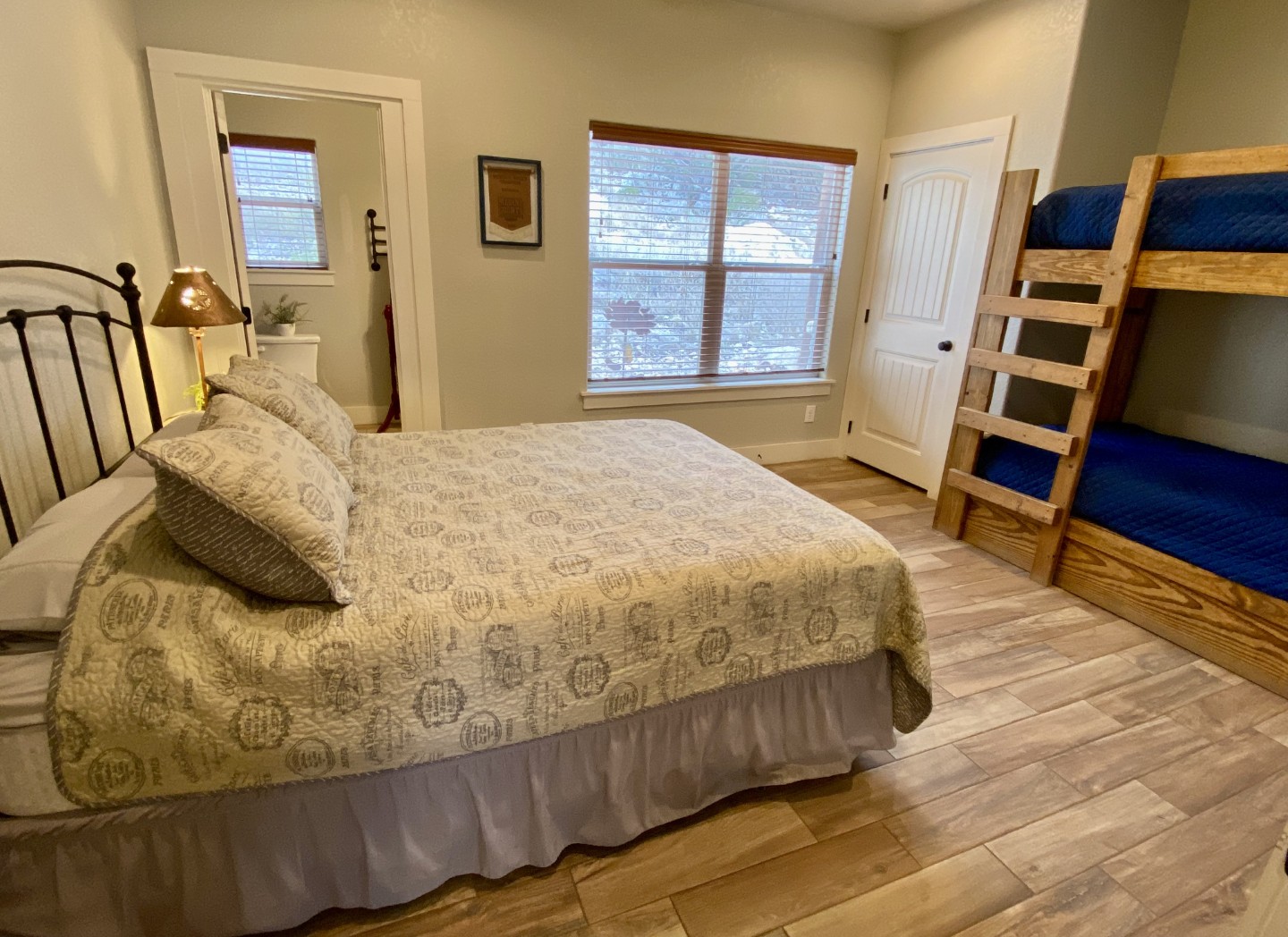 There are 3 bedrooms downstairs: Bedroom 1 has Queen bed and beautiful views. Bedroom 2 is the Master with King bed, ensuite bath and views. Bedroom 3 has a Queen and custom built in bunk beds. All bedroom views are simply stunning, with upscale furnishings and spacious.