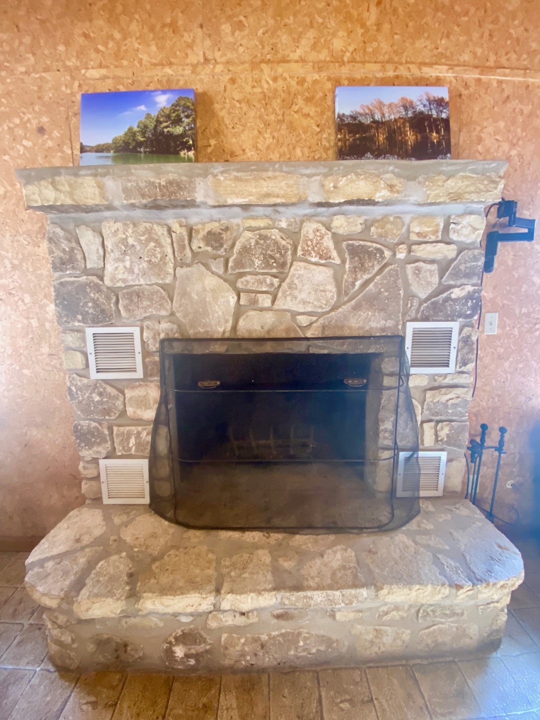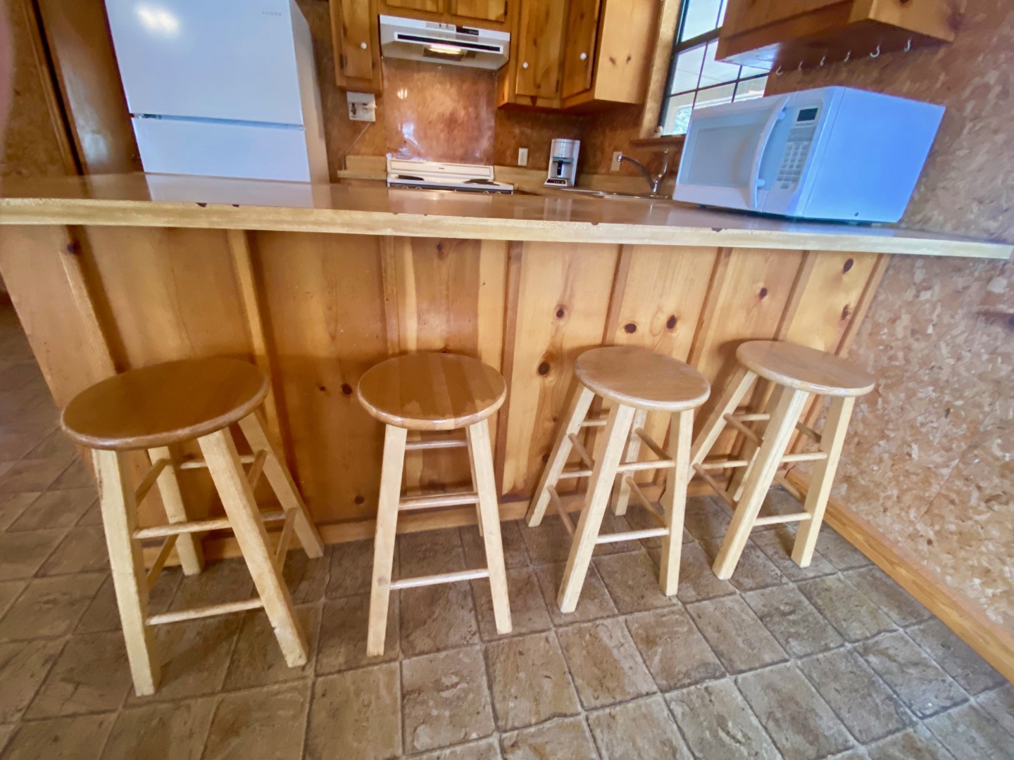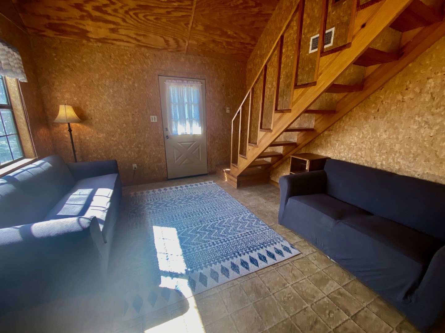 Inside you'll find new 2024 soft goods throughout the cabin. The living has vaulted ceiling, rock fireplace, open cedar staircase and saltillo tile floors. There's a smart tv, new sofa slipcovers and pretty wool rug.
