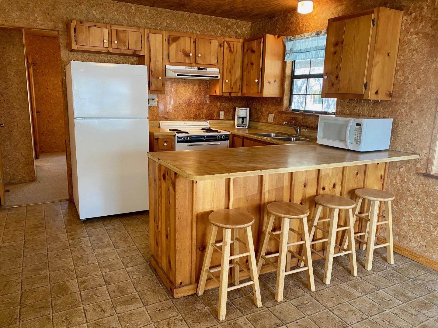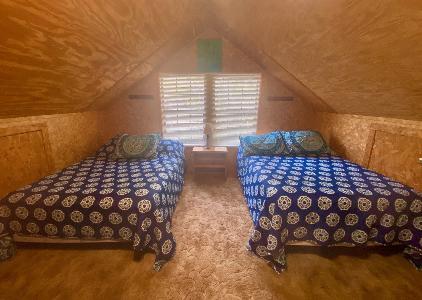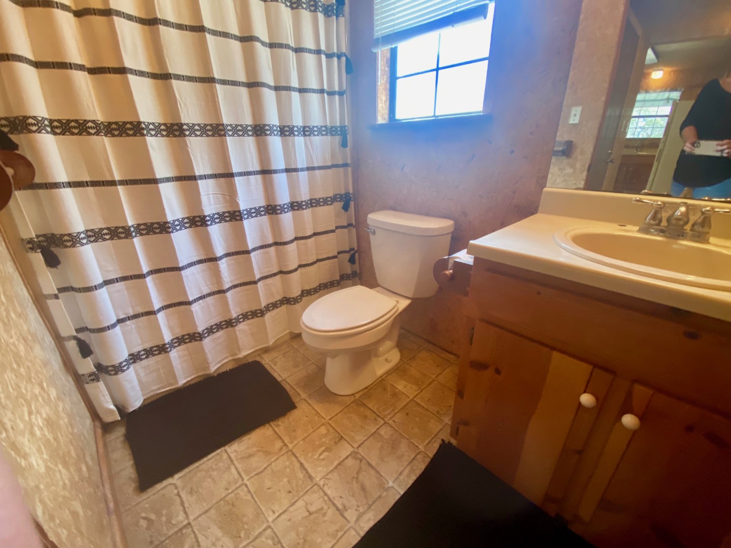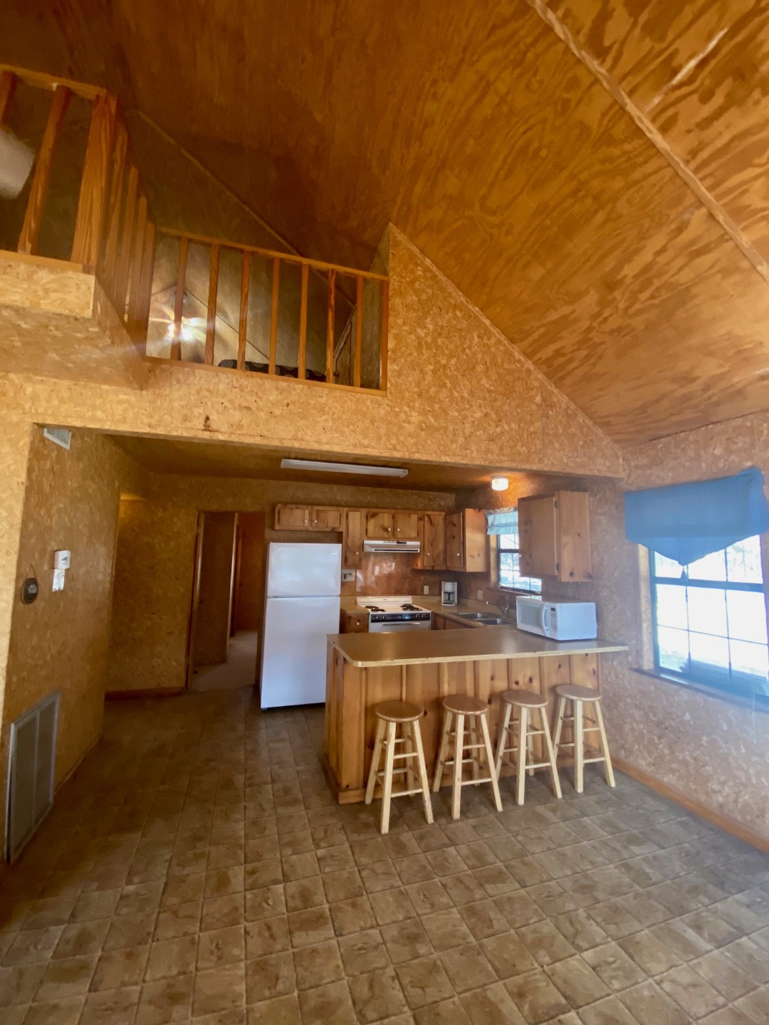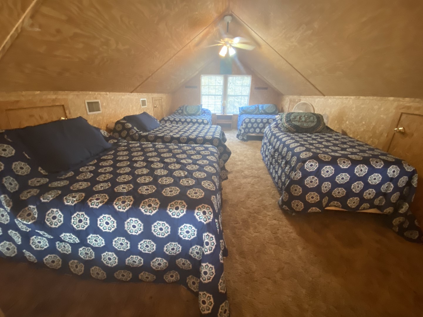 Cute kitchen with what y'all will need to make meals. The master bedroom is downstairs, has a queen bed with new bedding and an ensuite bathroom. Bedroom 2 has one queen bed with new bedding and an adjacent hallway bathroom. Upstairs under the vaulted ceiling is one large loft with (4) full beds, (1) twin bed and all new matching bedding.